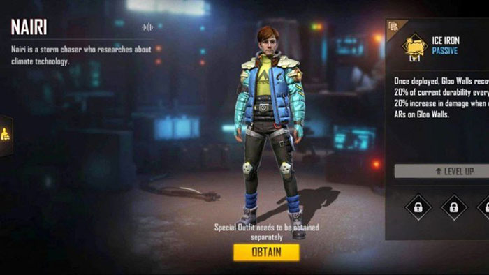 Nairi là một nhân vật khác trong Free Fire mà các kỹ năng tập trung vào Gloo Wall. Khả năng của anh ta cho phép người chơi hồi phục các Gloo Wall của chính họ theo thời gian, đồng thời gây thêm sát thương lên bức tường kẻ thù bằng AR. Sở hữu kỹ năng này cho phép người chơi chống lại các Gloo Wall hiệu quả hơn nhiều, trong khi tăng cường cấu trúc Gloo của riêng họ.