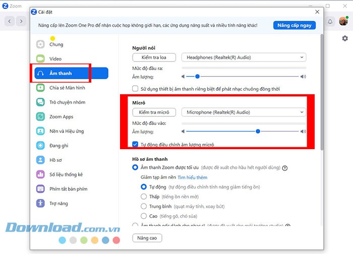 Để tìm menu này, hãy khởi động ứng dụng Zoom và nhấp vào biểu tượng cài đặt, sau đó chọn Âm thanh. Đảm bảo chọn đúng micro đang dùng và kiểm tra, điều chỉnh âm lượng nếu cần.