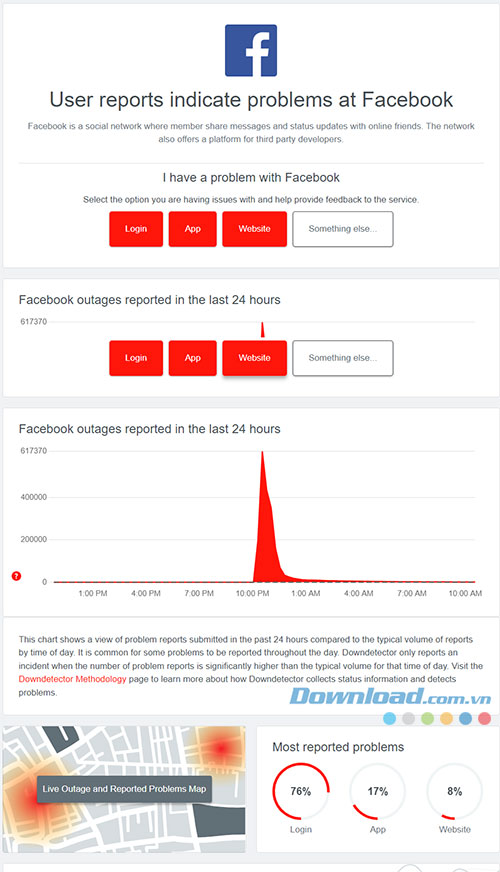 Nếu mọi cách khắc phục sự cố đều không hiệu quả, nguyên nhân khiến Facebook bị sập có thể là do máy chủ. Để kiểm tra tình trạng máy chủ Facebook, mọi người có thể truy cập trang web như Downdetector. Nó cũng sẽ cho biết liệu lỗi Facebook có bị giới hạn ở một khu vực cụ thể hay không. Nếu máy chủ ngừng hoạt động, mọi người không thể làm gì khác ngoài việc đợi Facebook tiến hành khắc phục sự cố.