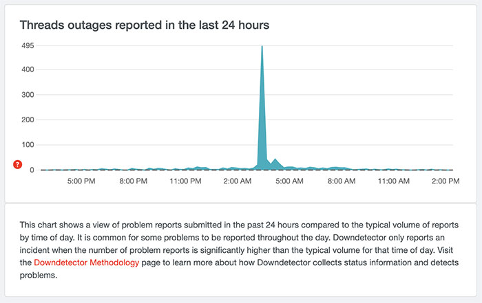 Người dùng sẽ không thể truy cập ứng dụng Threads nếu máy chủ không khả dụng do ngừng hoạt động hoặc bảo trì theo lịch trình. Threads không thể hoạt động trừ khi chúng có kết nối nhất quán với máy chủ, gây ra tình trạng bị sập và không cho phép người dùng đăng nhập vào nền tảng. Mọi người có thể kiểm tra trạng thái server Threads trên trang Downdetector.