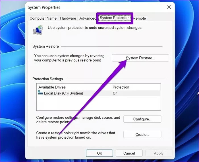Windows 11 có một tính năng tiện dụng là System Restore giúp thực hiện sao lưu toàn bộ hệ thống theo định kỳ. Những bản sao lưu như vậy có thể hữu ích khi gặp sự cố mà không thể giải quyết bằng các cách khác. Áp dụng cách này để đưa touchpad về nguyên bản trong trường hợp xảy ra lỗi.
