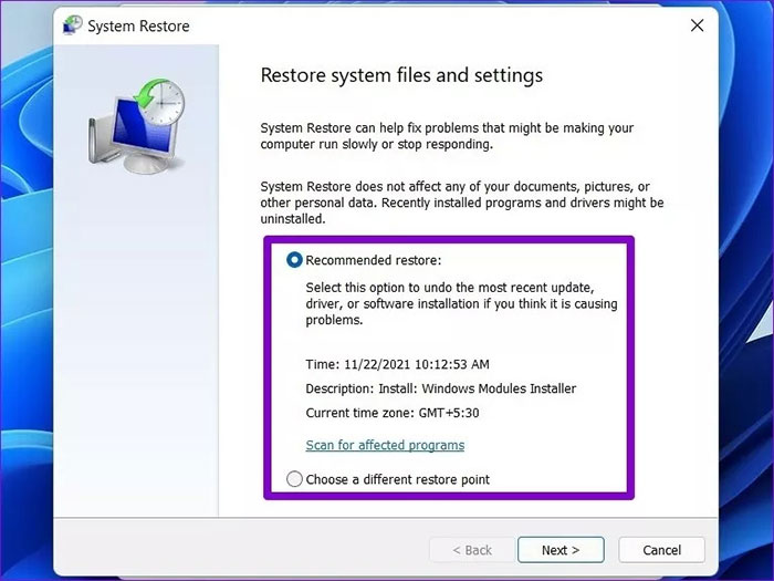 Bước 3: Người dùng có thể sử dụng điểm khôi phục được đề xuất hoặc tự mình chọn một điểm khác bằng cách nhấn vào tùy chọn thứ hai.