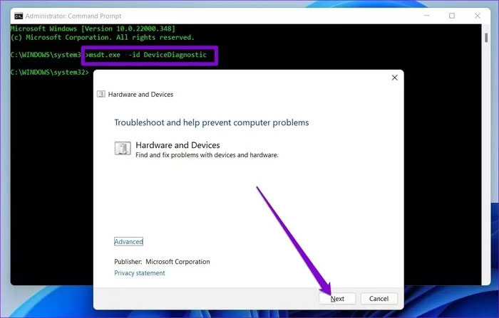 Bước 3: Trong cửa sổ Hardware and Devices vừa xuất hiện, nhấn Next để cho phép nó quét mọi vấn đề.