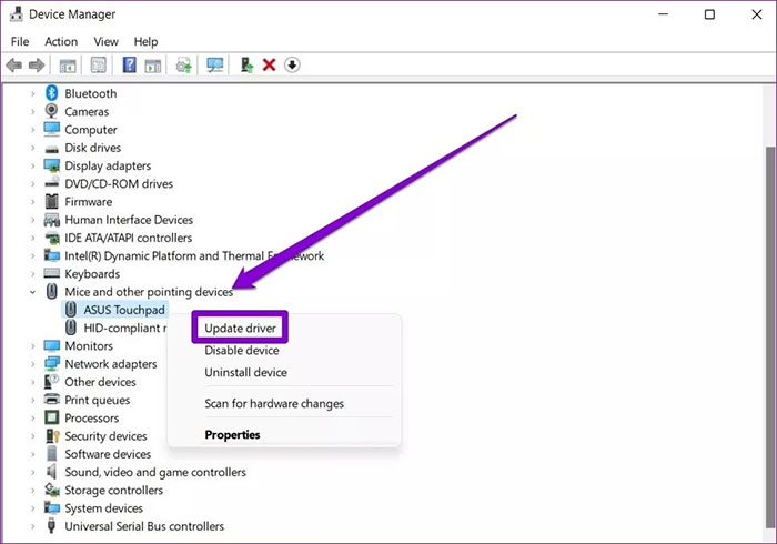 Bước 2: Mở rộng mục Mice and other pointing devices, nhấp chuột phải vào touchpad của mình và chọn Update driver option.