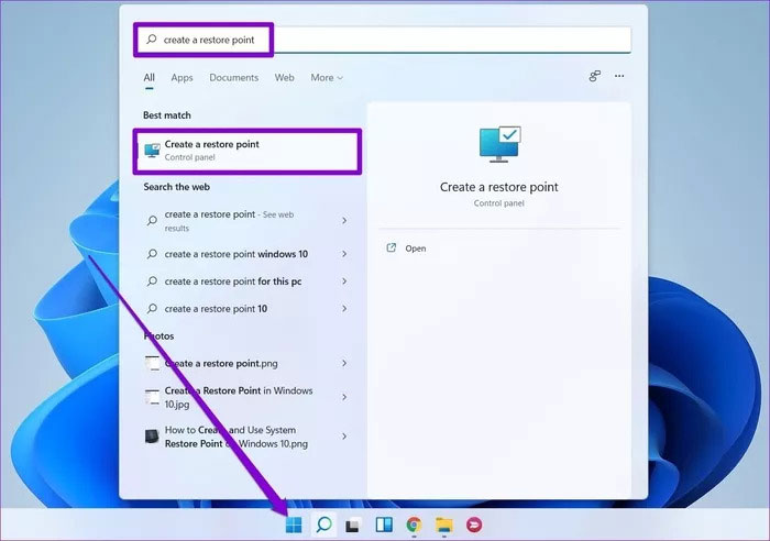 Bước 1: Mở Start, nhập create a restore point và nhấn Enter.