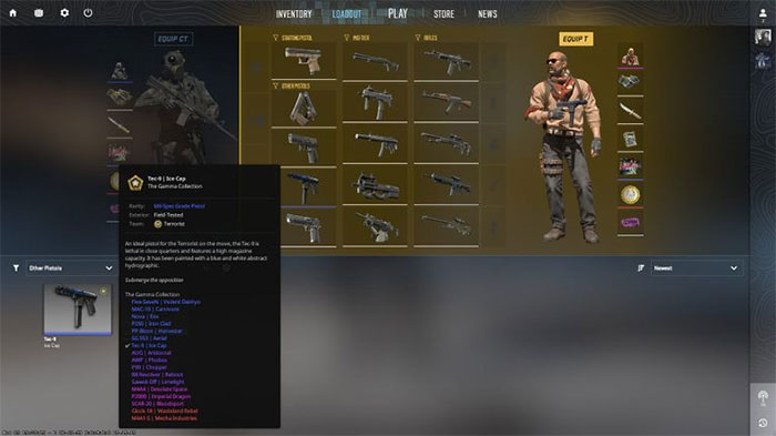 Để trang bị skin Agent, lựu đạn, dao, Account Badge,... hãy tìm cột bên cạnh mẫu CT hoặc T, tách biệt với menu Loadout. Nhấp vào từng biểu tượng để xem các vật phẩm có thể trang bị trong kho, hầu hết các trang bị này không bị hạn chế và có thể được sử dụng tự do, ngoại trừ Agent.