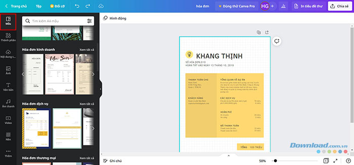 Nếu đã thiết lập Bộ nhận diện thương hiệu (Brand Kit) trong Canva, việc áp dụng màu sắc và phông chữ thương hiệu sẽ diễn ra rất nhanh chóng. Sau đó, mọi người có thể lưu hóa đơn dưới dạng PDF hoặc chia sẻ trực tiếp qua email từ Canva.