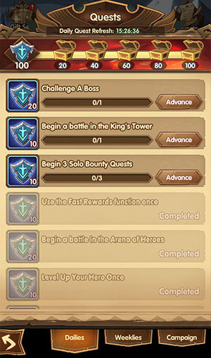 Trên menu chính, tab Quests nằm ở trên cùng bên phải của màn hình. Game thủ phải luôn hoàn thành danh sách đầy đủ các nhiệm vụ hàng ngày được đề xuất, từ đó thu thập 100 điểm hoạt động hàng ngày để sở hữu tất cả các rương liên quan.