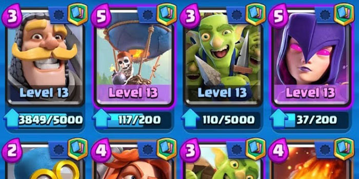 Các thẻ nên bao gồm nhiều loại như Common, Rare, Epic, Legendary và Champion. Sự đa dạng thẻ sẽ mang đến một loạt các đòn tấn công và phòng thủ khác nhau, đồng thời cân bằng bộ bài và đảm bảo không sử dụng quá nhiều Elixir trong các trận chiến.