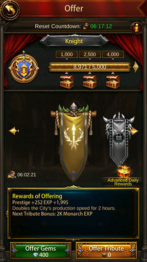 Người chơi có thể cung cấp đá quý tại đền thờ nằm gần cung điện của mình. Để có những cống phẩm tiết kiệm chi phí nhất, người chơi cần cung cấp 675 viên ngọc mỗi lượt.
