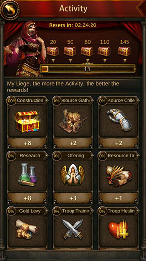 Thế giới Evony có rất nhiều hoạt động hàng ngày mà người chơi cần hoàn thành để thu thập tài nguyên, đá quý và gia tăng sản xuất. Vì trò chơi có tính cạnh tranh cao nên mọi người chắc chắn không nên bỏ lỡ những phần thưởng hàng ngày này, chúng có thể mang tới sự khác biệt giữa chiến thắng và thất bại.