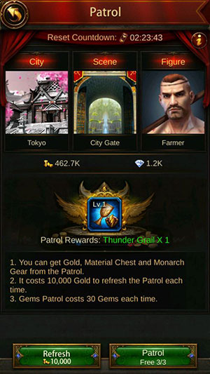 Game thủ cần điều động quân đội của mình để tuần tra xung quanh các bức tường thành. Điều này có thể được thực hiện miễn phí 3 lần một ngày và cung cấp một số tài nguyên. Sau 3 lần đó, trò chơi yêu cầu đá quý để tiếp tục tuần tra/