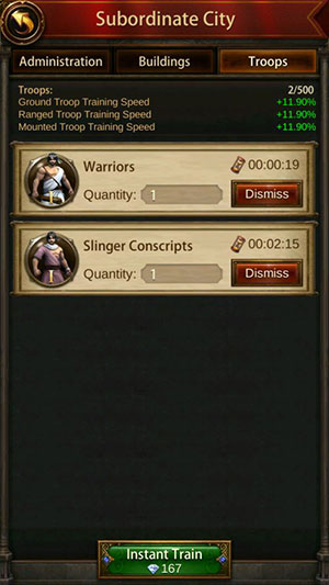 Ở cấp 11, game thủ sẽ mở khóa Subordinate City miễn phí, đây là các thành phố nhỏ, không thể kiểm soát một cách tự do mà chúng sẽ tự sản xuất vàng, nâng cấp cấu trúc và đào tạo các đơn vị. Những đơn vị này có thể được sử dụng để củng cố cấp bậc. Điều này được thực hiện bằng cách chọn các Subordinate City sẽ gửi binh lính khi tập hợp một cuộc hành quân.