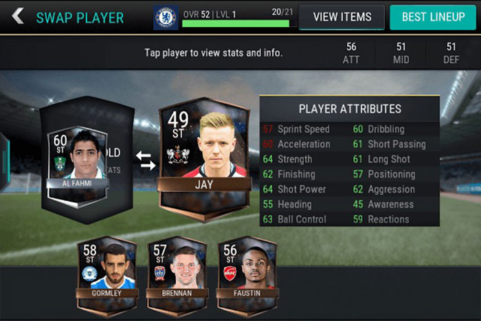 Con số ở góc trên bên trái của mỗi thẻ hiển thị xếp hạng tổng thể, vậy nên, hãy chọn thẻ có thống kê tổng thể tốt hơn so với cầu thủ hiện tại. Sau khi kéo thẻ mới vào vùng hoán đổi, game thủ sẽ nhận thấy rằng một số hoặc hầu hết các số thuộc tính của cầu thủ đã chuyển sang màu xanh lục, cho thấy thuộc tính của người mới tốt hơn thuộc tính hiện tại.