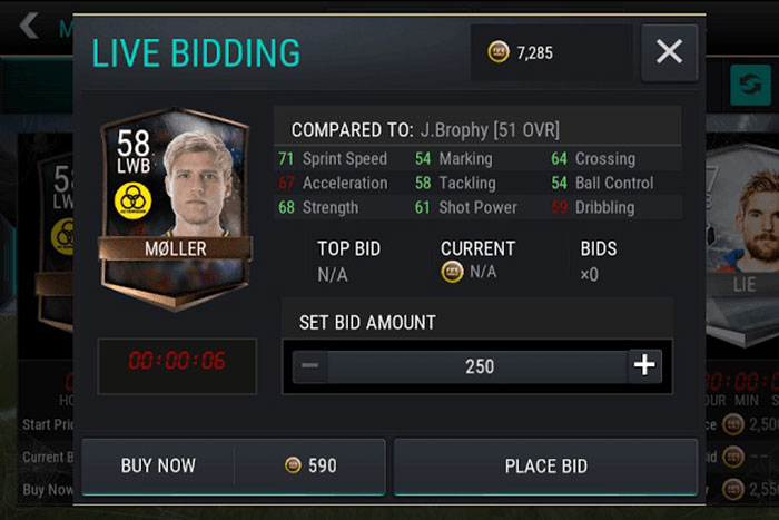 Một cầu thủ có thể được mua sẽ có một bộ đếm thời gian. Nhanh chóng chạm vào một thẻ như vậy để đặt giá. Nếu không đủ kiên nhẫn, hãy nhấn nút Buy Now, nhưng nó hoàn toàn không được khuyến khích vì giá thường sẽ cao hơn.