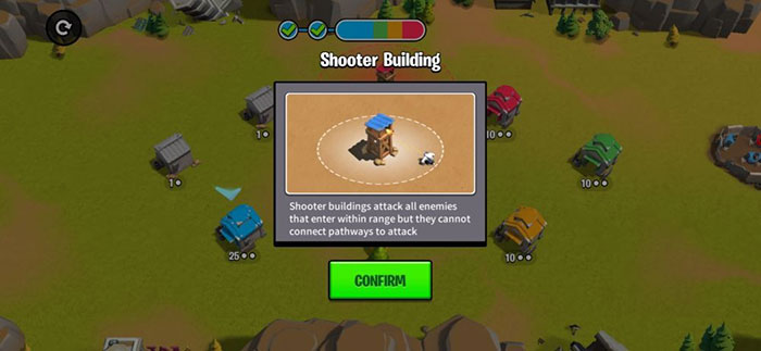 Một trong những nhiệm vụ chính bao gồm chiếm lấy các tòa nhà. Khi một tòa nhà có 3 chấm trắng, mọi người có thể kết nối 3 con đường cùng một lúc. Shooter Building tấn công tất cả kẻ thù xâm nhập trong phạm vi nhưng không thể kết nối các con đường để tấn công. Wall Breaker gây sát thương gấp đôi cho các công trình của đối phương.