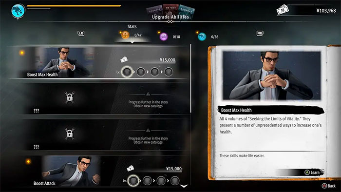 Một mẹo quan trọng khác là tập trung vào việc nâng cấp khả năng. Những nâng cấp chiến đấu này có thể là cơ bản, như tăng sát thương và sức khỏe. Những thứ khác cụ thể hơn, như mở khóa các combo mới và Heat Move. Không giống như các trò chơi khác trong series này, Like A Dragon Gaiden không có hệ thống XP truyền thống.