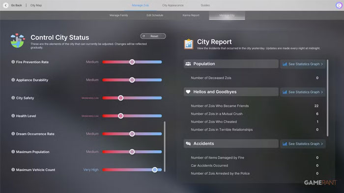 Trước khi nhấn nút chơi, mọi người có thể muốn chỉnh sửa thế giới mà Zois sinh sống, giúp tạo dựng bối cảnh cho câu chuyện. Việc này được thực hiện bằng cách nhấn M để mở bản đồ, sau đó nhấp vào Manage City ở phía trên màn hình.