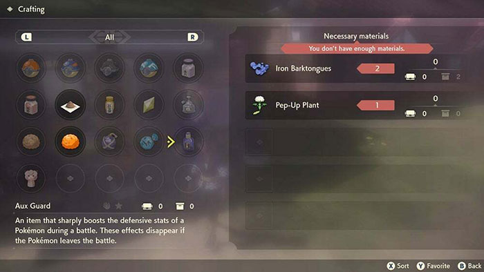 Giống như nhiều trò chơi hiện đại, Pokémon Legends: Arceus có tính năng thu thập và chế tạo. Nó giống nhất với loạt game Monster Hunter, và thậm chí còn có một hộp vật phẩm. Người chơi sẽ muốn thu thập nhiều nguyên liệu, vì chế tạo là cách nhanh nhất, dễ nhất, rẻ nhất để kiếm được nhiều vật phẩm quan trọng như Poke Balls và bình máu.