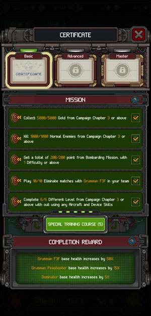 Certificate là cách khó nhất để nâng cấp một chiếc máy bay, nhưng mang lại một sự cải tiến thúc đẩy lớn. Hãy tiết kiệm những viên đá quý và tham gia vào các sự kiện để trang bị các nâng cấp tuyệt vời cho máy bay chiến đấu của mình.