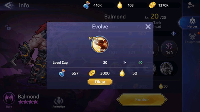 Khi đạt đến cấp độ 20, anh hùng có thể được tiến hóa bằng tinh chất nâng cao, tiền xu và EXP. Tinh chất nâng cao có thể lấy từ chiến dịch, mua trong cửa hàng và tháp babel. Sau khi tiến hóa một anh hùng, giới hạn cấp độ của anh ta được nâng lên từ cấp 20-40 và ở cấp 21 thì có thể mở khóa một Ultimate mới.