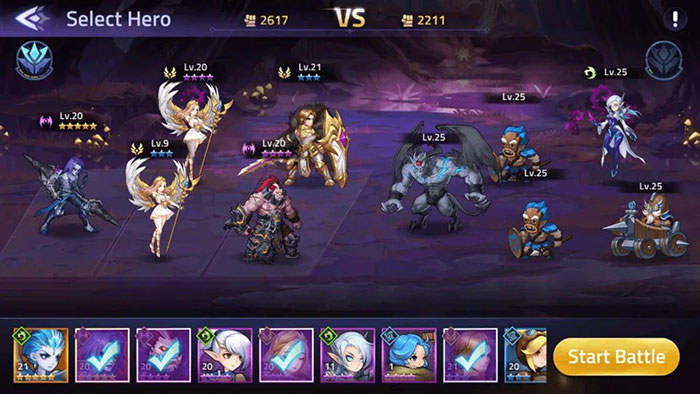 Người chơi cần đảm bảo chiêu mộ 5 anh hùng, mỗi anh hùng thuộc một loại vào đội hình của mình. Một anh hùng thuộc loại mạnh hơn sẽ gây thêm 30% sát thương lên kẻ thù. Dưới đây là sự phản ứng giữa các loại: