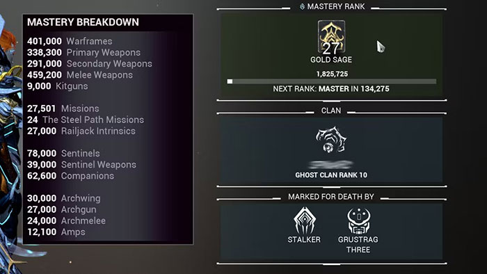 Mastery Rank là cấp độ tổng thể, một trong những tính năng quan trọng nhất trong Warframe. Nâng cao nó sẽ mở khóa vũ khí và nhiệm vụ mới, đồng thời nâng cấp khả năng mang của Void Trace, Focus, mod,... Có một số cách để nhận kinh nghiệm, nhưng hãy tập trung vào khám phá biểu đồ sao và nâng cấp tất cả trang bị lên level 30. Khi đạt đủ kinh nghiệm yêu cầu, người chơi có thể thực hiện bài kiểm tra để nâng thứ hạng của mình.