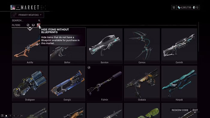 Warframe và vũ khí mới yêu cầu cả bản thiết kế, các bộ phận cụ thể, hoặc tài nguyên, được chế tạo trong xưởng đúc. Game thủ có thể mua bản thiết kế tại tab Market và kiểm tra hide items without blueprints để dễ dàng phát hiện các vật phẩm có sẵn. Warframe có thể kiếm được bằng cách đánh bại các boss cụ thể.