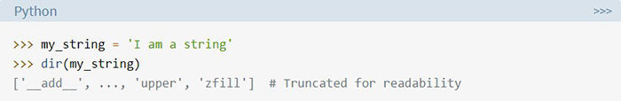Các phần tử được trả về từ dir () là tất cả các phương thức (tức là các hành động) có thể áp dụng cho phần tử. Ví dụ: