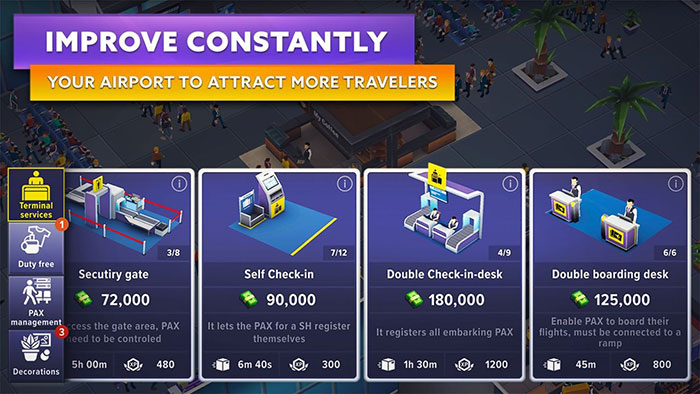 Game thủ cũng cần làm hài lòng hành khách bằng cách xây dựng cơ sở hạ tầng và kiếm thêm lợi nhuận. Quản lý hành khách đến và đi bằng cách xây dựng cổng làm thủ tục và nới lỏng quy trình an ninh.
