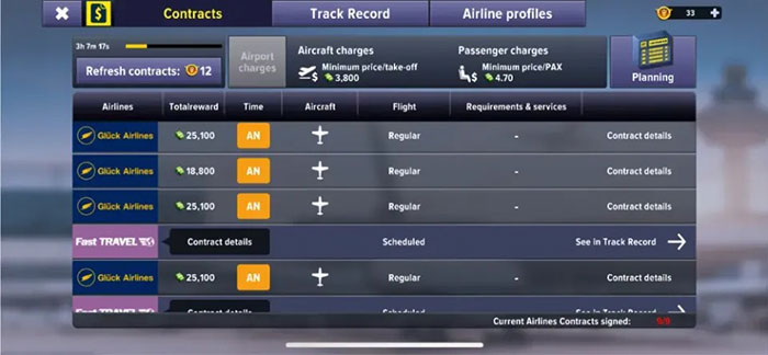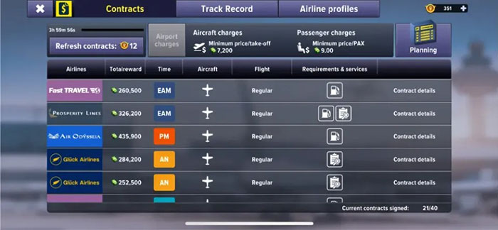Để trở thành người điều hành sân bay thành công, game thủ cần xem xét các hợp đồng của mình bằng con mắt sáng suốt và quản lý chúng một cách hiệu quả. Khi bắt đầu trò chơi, mọi người chỉ có thể đăng ký 2 hợp đồng cùng một lúc. Game thủ phải đặt chúng vào trong lịch trình của mình trước khi tiến hành ký thêm.