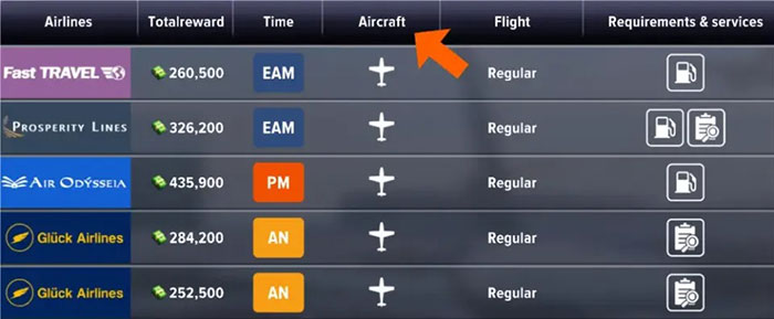 Chọn các danh mục sẽ làm cho trò chơi tự động sắp xếp các hợp đồng theo danh mục đó. Tính năng này giúp nhóm các chuyến bay có cùng Hãng hàng không (Airline), Thời gian (Time), Máy bay (Aircraft), Loại chuyến bay (Flight Type) cũng như Yêu cầu (Requirement) và Dịch vụ (Service). Nhấp vào Total Reward sẽ cho phép game thủ sắp xếp các hợp động từ lợi nhuận thấp nhất đến cao nhất hoặc ngược lại nếu nhấn 2 lần.