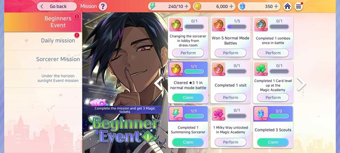 Arcana Twilight có 4 loại nhiệm vụ: Beginners Event, Daily Mission, Event Mission và Sorcerer Mission. Beginners Event là nhiệm vụ dành riêng cho người mới bắt đầu. Hoàn thành các nhiệm vụ này sẽ giúp tân thủ có cái nhìn tổng quan rõ ràng về trò chơi.