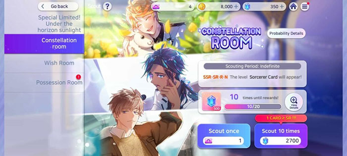 Người chơi có thể tìm kiếm và thu thập các thẻ nhân vật khác nhau. Các nhân vật có độ hiếm khác nhau và mỗi cấp độ có sức mạnh, khả năng riêng biệt. SSR là thẻ hiếm nhất trong trò chơi và rõ ràng là thẻ mạnh nhất, tiếp theo là SR với độ hiếm thấp hơn, R có thể thu thập bằng cách hoàn thành các nhiệm vụ. Cuối cùng là thẻ N không quá mạnh và hữu ích, mặc dù chúng có thể được sử dụng vào đầu trò chơi, khi tài nguyên còn thiếu thốn.