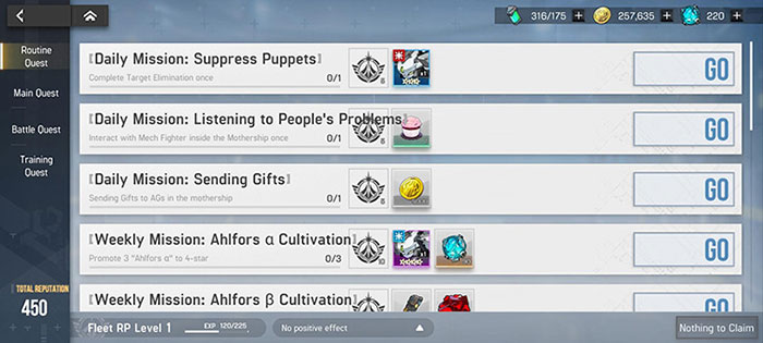 Như bất kỳ trò chơi điện tử nào khác, Artery Gear: Fusion cũng có một hệ thống nhiệm vụ hàng ngày và hàng tuần. Nhiệm vụ của người chơi là phải hoàn thành tất cả. Vượt qua mọi yêu cầu này, game thủ sẽ thu thập được hàng tấn tài nguyên quan trọng trong trò chơi một cách dễ dàng.
