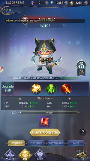 Truy cập phần Creature của trò chơi từ biểu tượng sinh vật ở cuối trang. Mọi người có thể truy cập Mount, Pet và Beast từ phần này. Nâng cấp Mount bằng cách sử dụng Mount Essence, Pet bằng Pet Essence. Thú cưng sẽ nhận được một skin mới sau mỗi lần nâng cấp cấp độ. Truy cập mục Beast khi nhân vật đạt R4 M1.