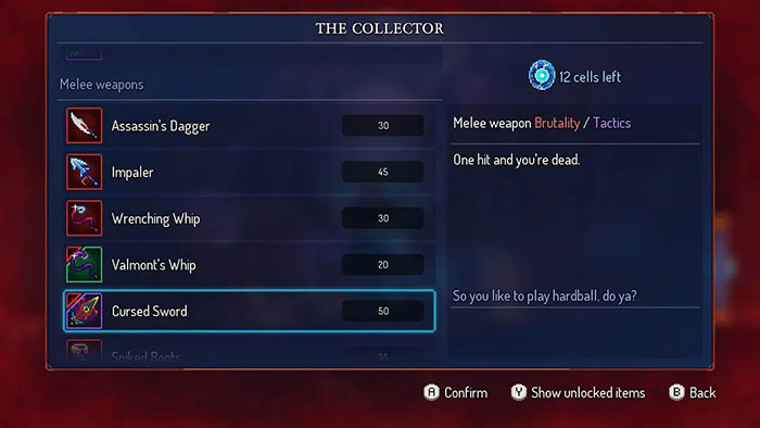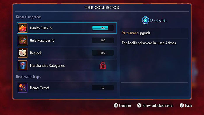 Chờ đợi giữa các quần xã, The Collector yêu cầu tất cả các tế bào tích lũy của bạn đầu tư vào nâng cấp, vũ khí và đột biến. Các giao dịch với The Collector và những người bạn của anh ta là Guillain và The Blacksmith là chìa khóa để tiến bộ và tăng khả năng sống sót sau này. Tương tự như Hollow Knight đương thời của Dead Cells, bạn sẽ háo hức tìm ra bí mật ngay lập tức. Bạn nên gặp The Collector trước, điều này sẽ làm rõ tiến trình và nên được coi là ưu tiên hàng đầu khi chơi Dead Cells.