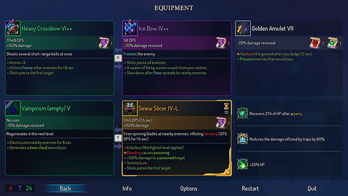 Hãy tập trung vào các vật phẩm có thể dễ dàng gây hiệu ứng. Infantry Bow tạo ra những đòn chí mạng khi sử dụng nó gần đối phương, trong khi Blood Sword luôn tạo ra sát thương chảy máu. Những thứ cần tránh là thu thập là The Impaler hoặc Spartan Boots vì đều có những yêu cầu về môi trường quá mâu thuẫn để có thể dựa vào.