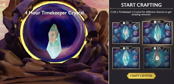Pha lê của Timekeeper là một tinh thể miễn phí mà game thủ có thể tạo ra để đổi lấy những người bảo vệ, vàng hoặc năng lượng, nhưng nó sẽ cần nhiều lần. Nó được chia thành 4 lần, bắt đầu từ 2 giờ cho đến 8 giờ.