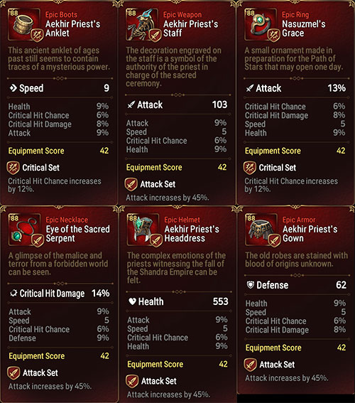 Epic Seven cung cấp các bộ trang bị sẽ giúp người anh hùng mặc nó tăng cường thêm thuộc tính. Mọi người có thể lấy trang bị từ những chiếc rương bắt gặp khi tham gia trận chiến.