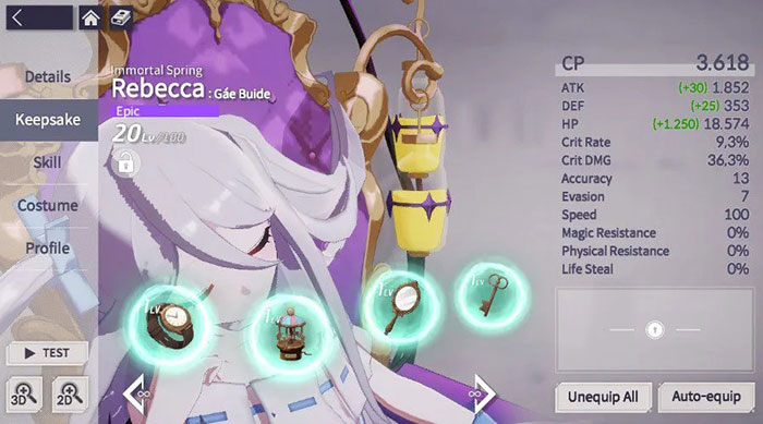 Ngoài việc tăng cấp, game thủ có thể sử dụng Equipment hay còn gọi là Keepsake trong trò chơi này. Nếu không biết nên sử dụng trang bị nào, thì chỉ cần sử dụng tính năng Auto-Equip.