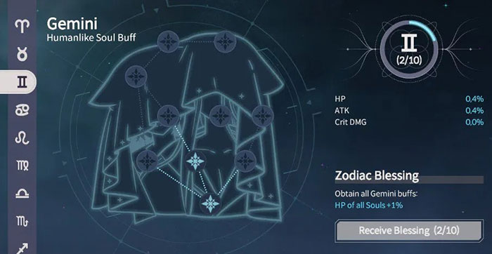Zodiac hoạt động tốt khi đã có một đội vững chắc vì nó có thể nhận được buff linh hồn cho một số loại nhất định. Vì vậy, khi có một nhóm với thành phần đội chiếm ưu thế hơn đối với Humanlike, thì hãy cầu nguyện cho cung Gemini (Song Tử). Điều này thực sự phụ thuộc vào thành phần của nhóm của người chơi.