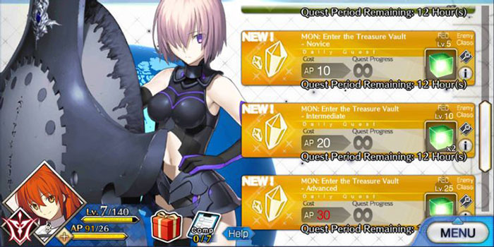 Ưu tiên đầu tiên bất cứ khi nào mở trò chơi này là thực hiện các nhiệm vụ hàng ngày. Những nhiệm vụ này sẽ mang lại cho người chơi một lượng thẻ XP ổn định để tăng cấp Servant và các Mana Prism tiền tệ cao cấp.