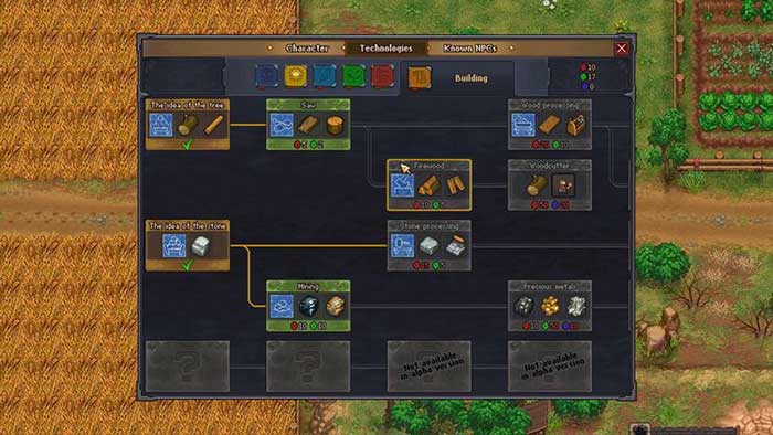 Được sắp xếp thành 7 danh mục, cây công nghệ sử dụng các điểm công nghệ màu đỏ, xanh lá cây và xanh lam để mở khóa, ngoại trừ tab thứ 7 là Cookery. Tab này hiển thị cho game thủ tất cả các công thức nấu ăn đã khám phá và có thể thực hiện. Với hơn 30 công thức nấu ăn, người chơi có thể chuẩn bị một loạt các loại thực phẩm khác nhau cho nhân vật của mình và bán chúng.