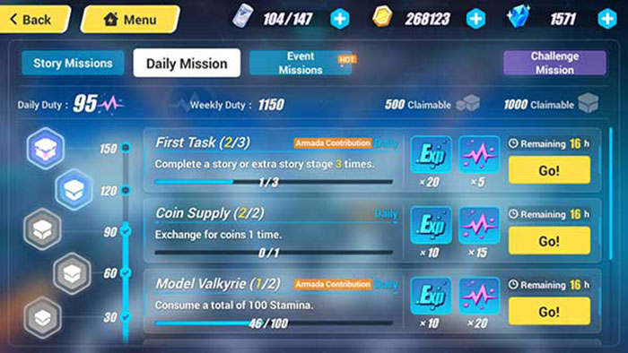 Nhiệm vụ hàng ngày là một phần không thể bỏ qua trong Honkai Impact. Người chơi sẽ nhận được pha lê, kinh nghiệm, vũ khí và các vật phẩm nâng cấp. Nếu bạn muốn biết cách chơi Honkai Impact để tối đa hóa nhân vật của mình, thì nhiệm vụ hàng ngày là điều bắt buộc.