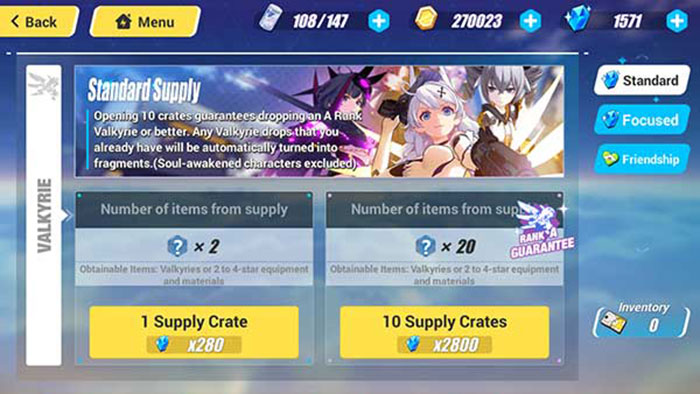 Người chơi chỉ nên sử dụng vé để quay gacha, ngay cả khi chỉ đủ vé thực hiện 1 lần. Không giống như các game gacha khác, trò chơi này tích lũy số lần quay gacha, do đó người chơi không cần phải thực hiện tất cả 10 lần cùng một lúc để hưởng lợi từ tỷ lệ nhận nhân vật S cao hơn. Cứ sau 10 lần kéo, người chơi được đảm bảo ít nhất là 1 Valkyrie mạnh.