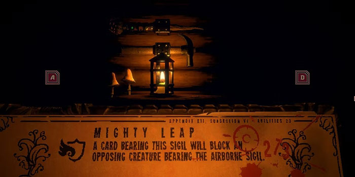 Có rất nhiều gợi ý ẩn xung quanh cabin của Leshy. Ví dụ, sự kết hợp với két an toàn nằm ở trang 22 của hướng dẫn sigil. Trong trò chơi này, tốt nhất là nên chạm vào mọi thứ mà mình có thể. Khi phải bắt đầu lại sau thất bại, hãy thử lấy những ngọn nến trên kệ ở phía sau.