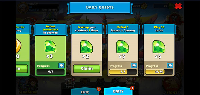 Để giành được Gem miễn phí, tất cả những gì cần làm là hoàn thành nhiệm vụ. Mighty Party cung cấp các mục tiêu hàng ngày và thưởng 2-3 Gem khi hoàn thành mỗi mục tiêu. Nếu hoàn thành tất cả, người chơi sẽ nhận được 11 Gem và 100 Gem nếu hoàn thành mọi nhiệm vụ trong tuần.