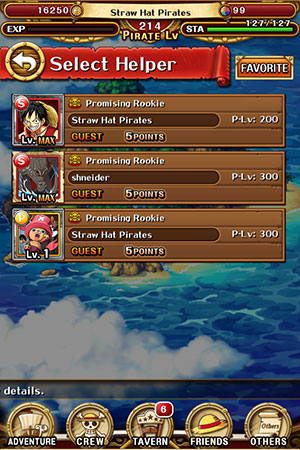 One Piece Treasure Cruise cho phép người chơi chọn một thuyền trưởng khách mời để hỗ trợ mình trong trận chiến. Sẽ có 3-4 khách trợ giúp. Trước khi hoàn thành lựa chọn cuối cùng, hãy nhấn vào hồ sơ người trợ giúp để xem các số liệu thống kê như HP, ATK và RCV. Chọn một thuyền trưởng khách có tỷ lệ HP và ATK cao.