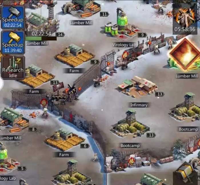 Mọi người nên bắt đầu với 3 nông trại và 3 phòng thí nghiệm Virology, sau đó nâng HQ lên cấp 3 và mở khóa thêm một vùng đất nữa. Ở đó, đặt 2 xưởng cưa gỗ hoặc 3 doanh trại quân đội.